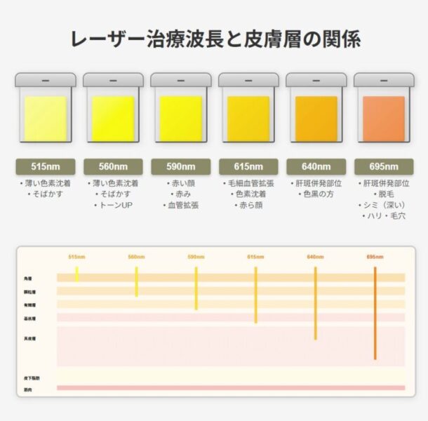 この対応力の高さは、ステラM22が搭載する複数のフィルターにより異なる波長を選択できることによります。具体的には、表皮付近のメラニン色素を狙う波長のフィルターがシミやそばかすを効果的にケアし、血管に作用する波長は赤ら顔や毛細血管拡張症にアプローチします。さらに、真皮層まで届く波長のフィルターがコラーゲンの生成を刺激し、肌の弾力アップや小ジワの改善にも寄与しています。